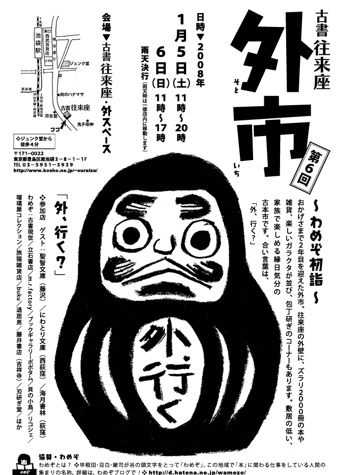 私事ですが、2008年1月5日(土)、6日(日)に池袋は「往来座」で開催されるの外市で、「わめぞ」の女番長、武藤良子さんと「売り上げ対決」をすることになりました。